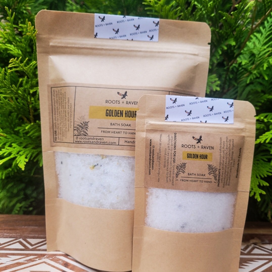 A luscious blend of Epsom, dead sea salt + Hawaiian Black Lava salt, in a citrus blend of frankincense, litsea and lemon with apricot oil. ** solidago bits when in season.
