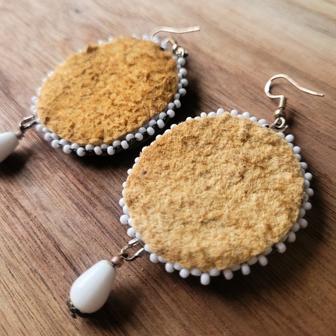 Sweetgrass braid grown and harvested by hand and braided with good intentions for the unity of ourmimd body and spirit. Elk antler slices from Northern Ontario take the center. Navked on home tanned and smoked moose hide. Antique teardrop finding.